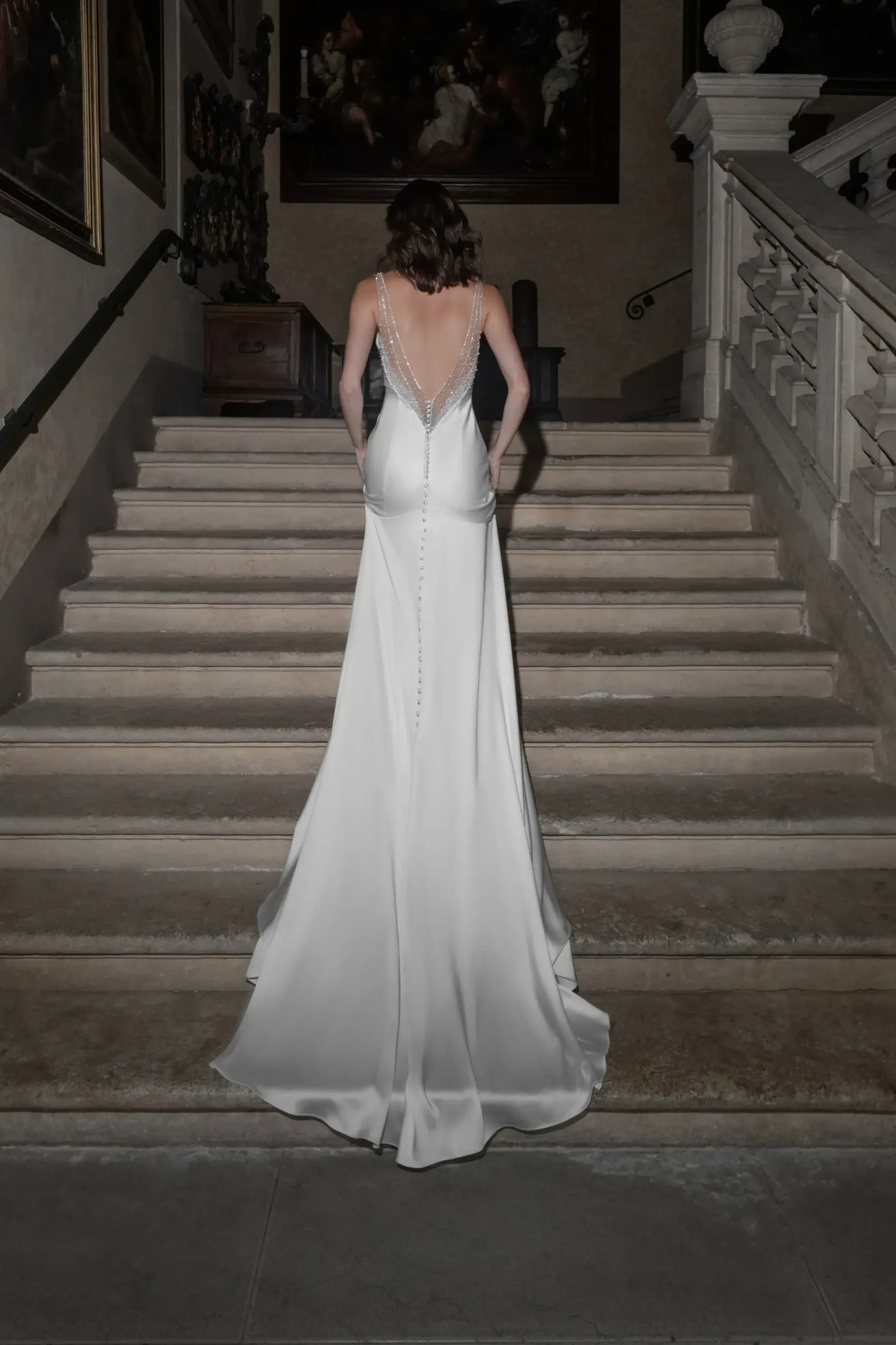 This 1920s-inspired stretch satin sheath, the Opi gown, is topped with a delicate sleeveless empire bodice of beads and pearls.